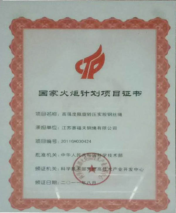 国家火炬计划项目证书